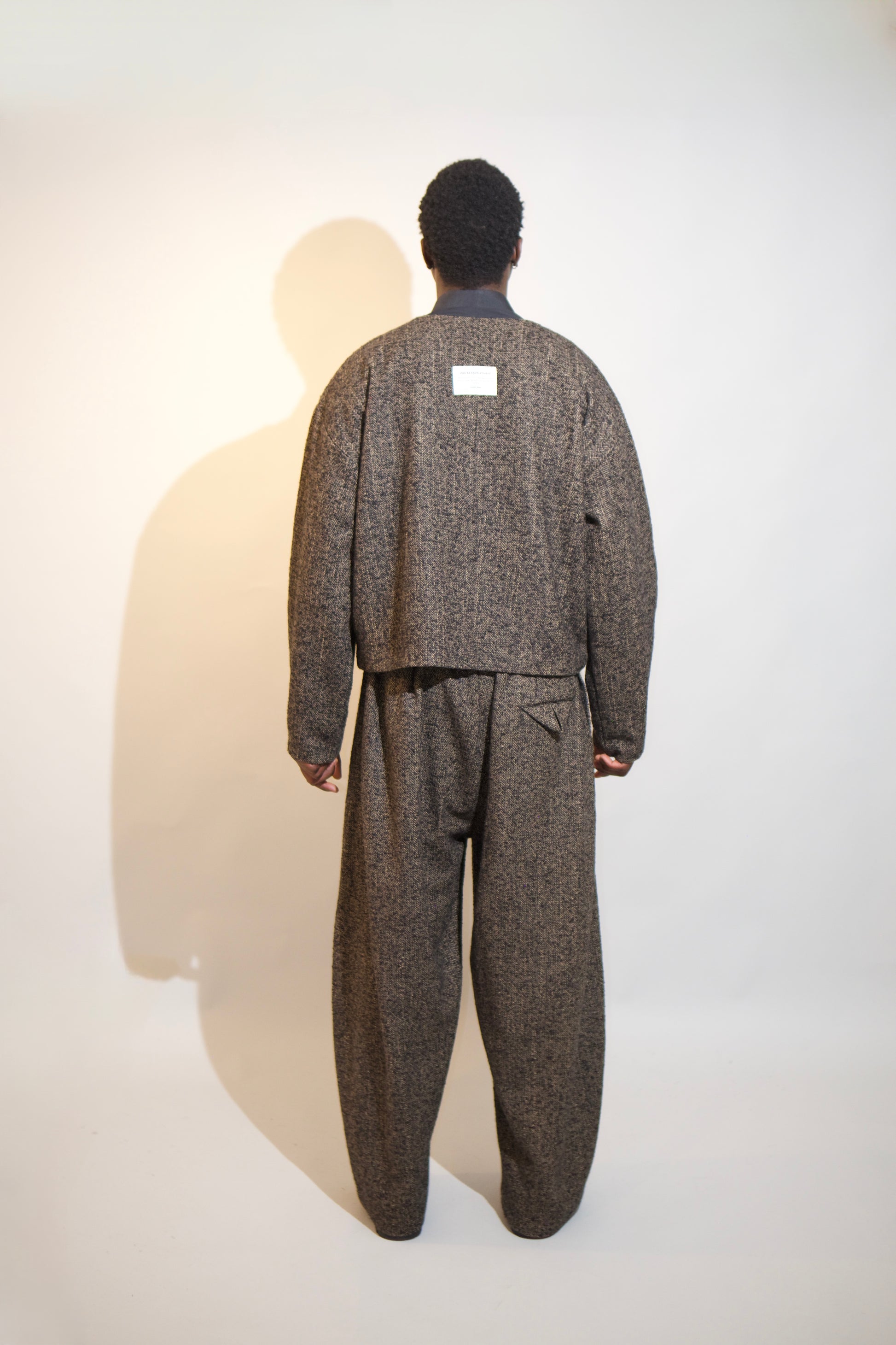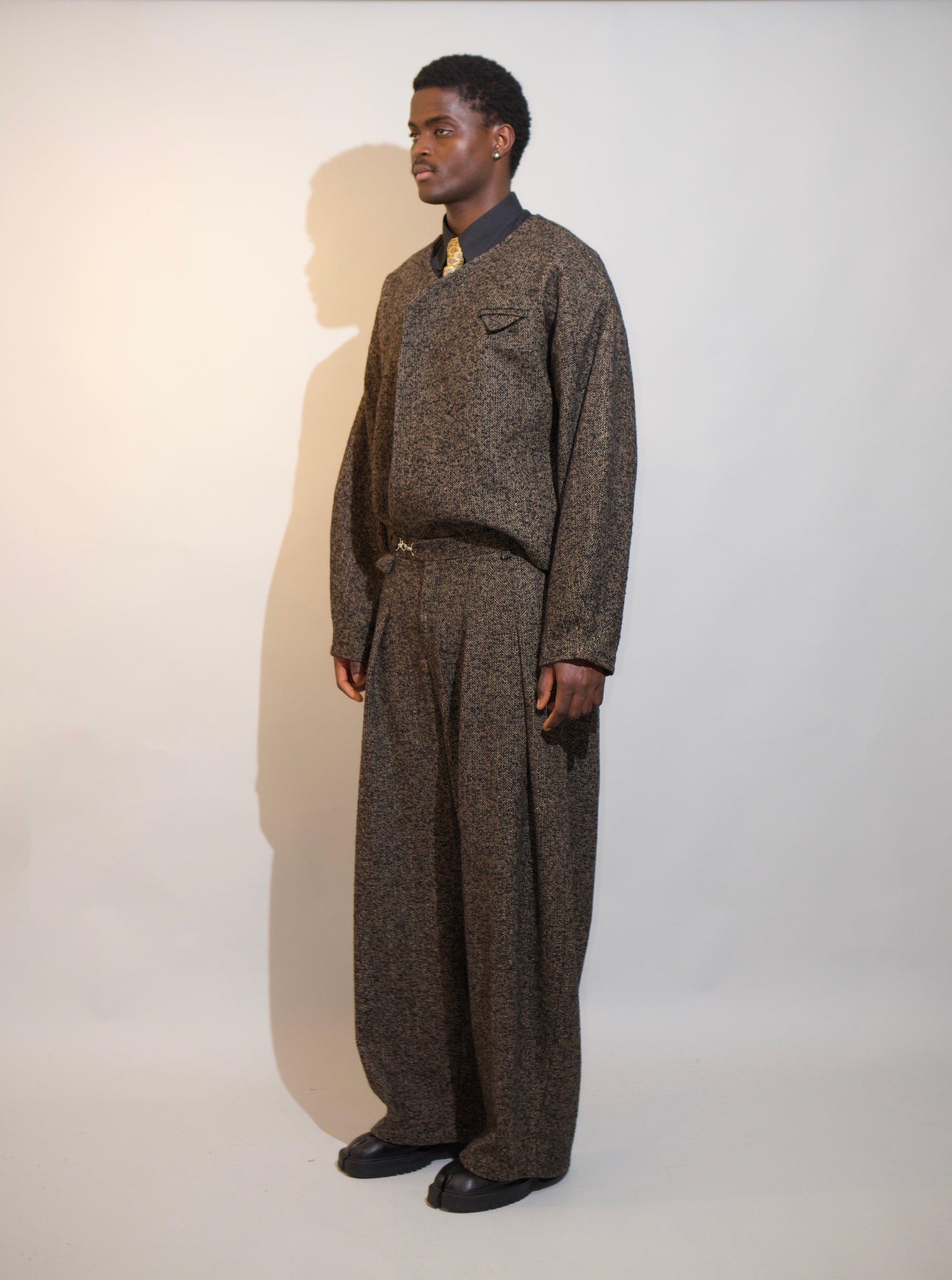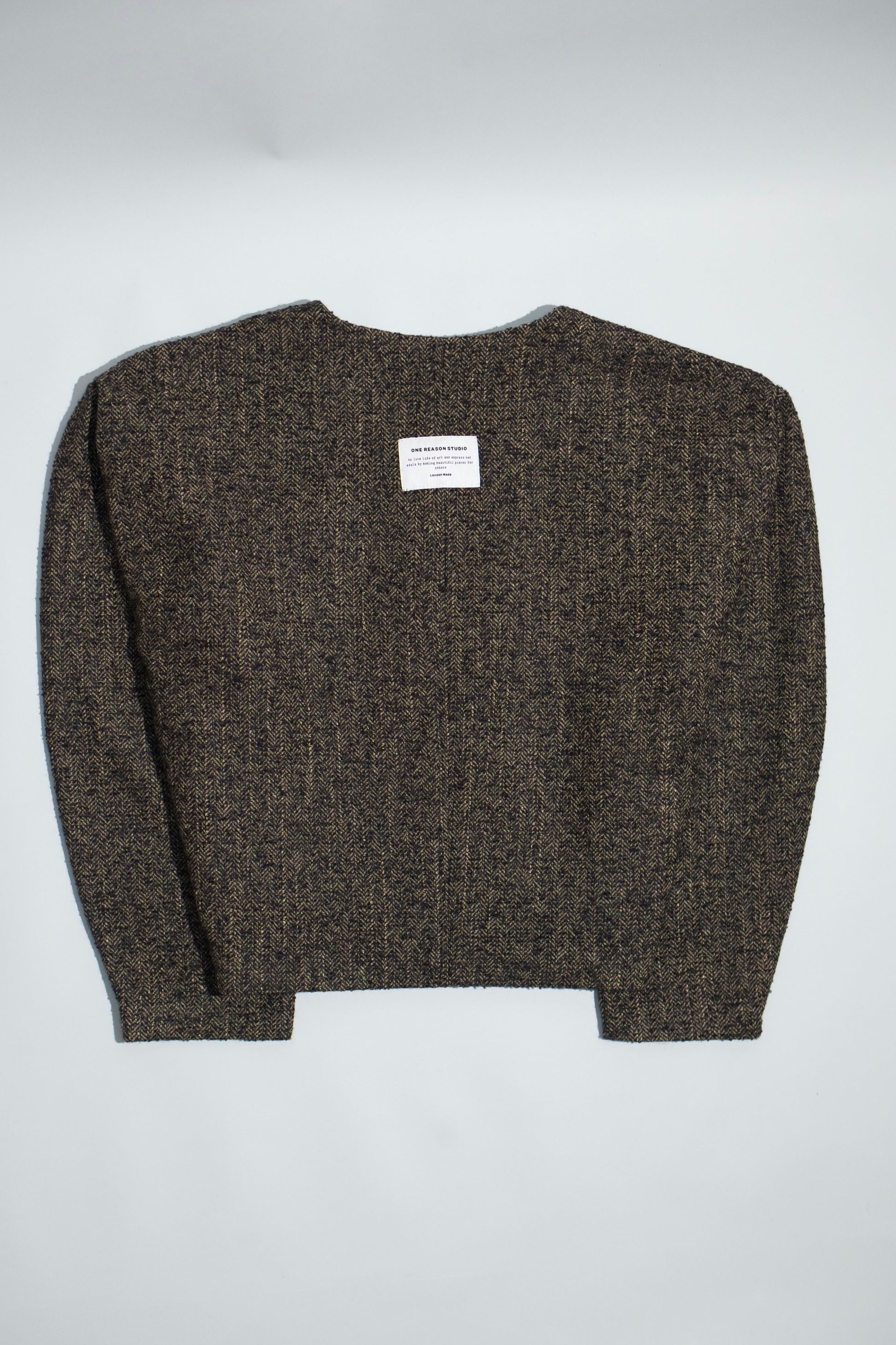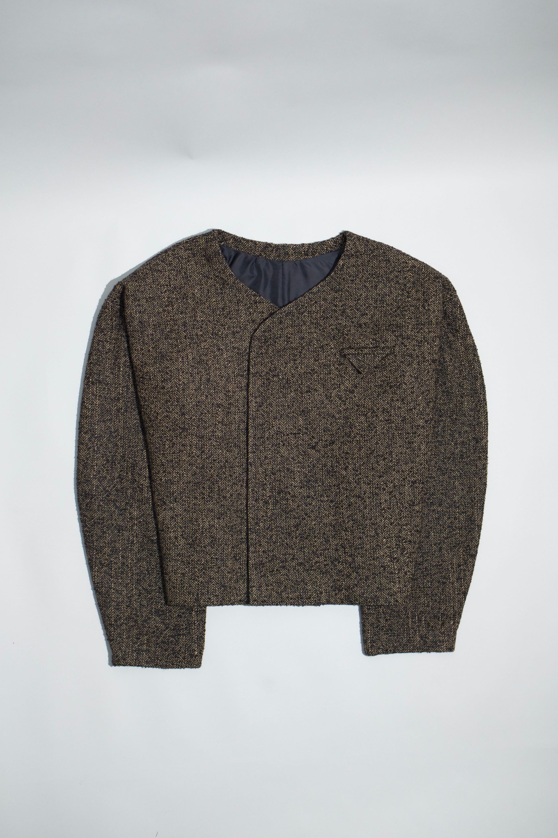 This refined, modern jacket features a textured woven fabric with a subtle herringbone pattern in Dark Umber color, offering warmth, structure, and a lightweight comfortable feel. Designed with a clean collarless V-neck, it creates a sharp, contemporary silhouette ideal for smart layering. The concealed front closure enhances its minimalist look while keeping the finish streamlined. A smooth inner lining allows easy wear over shirts or knitwear for versatile everyday styling