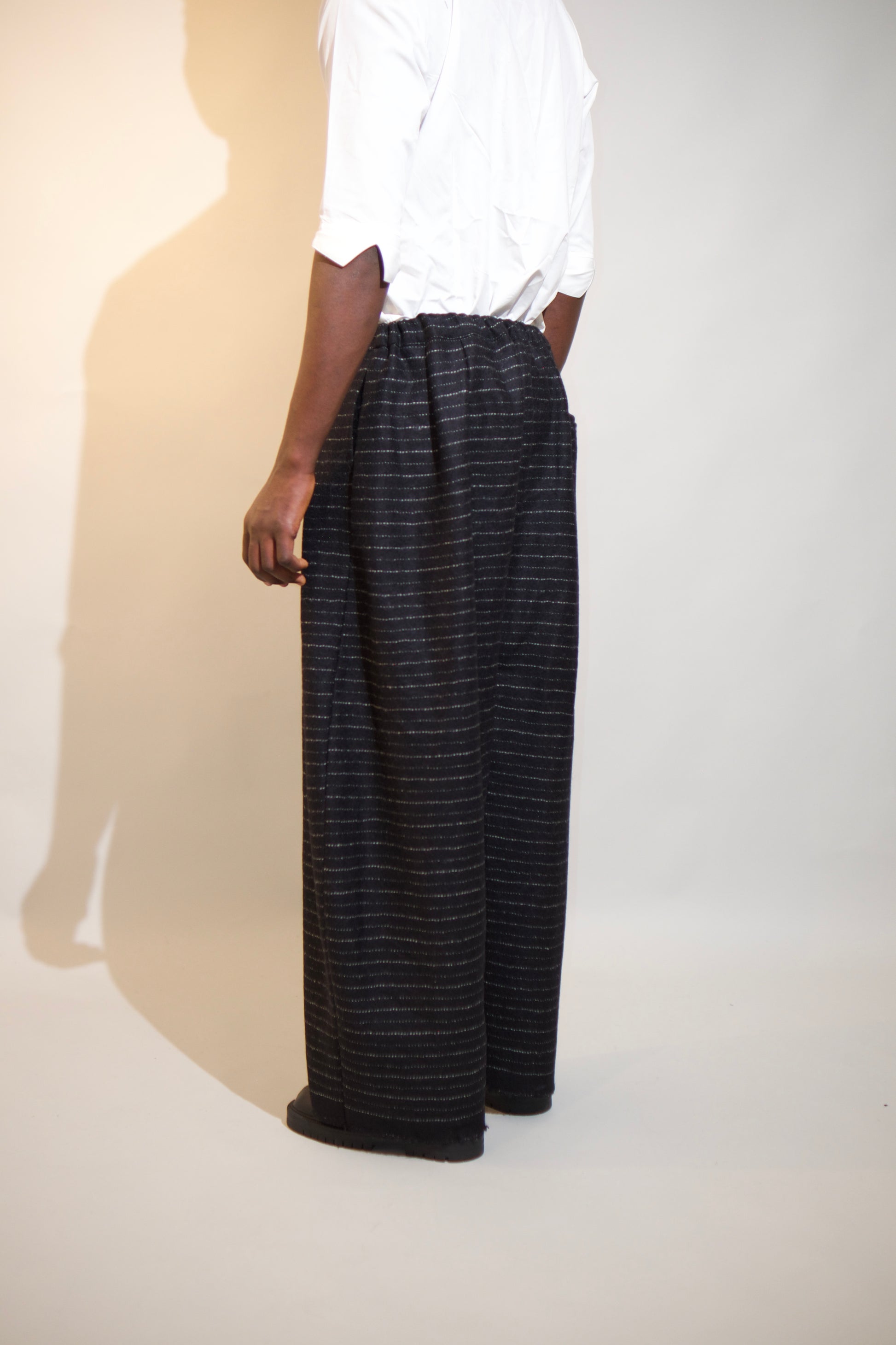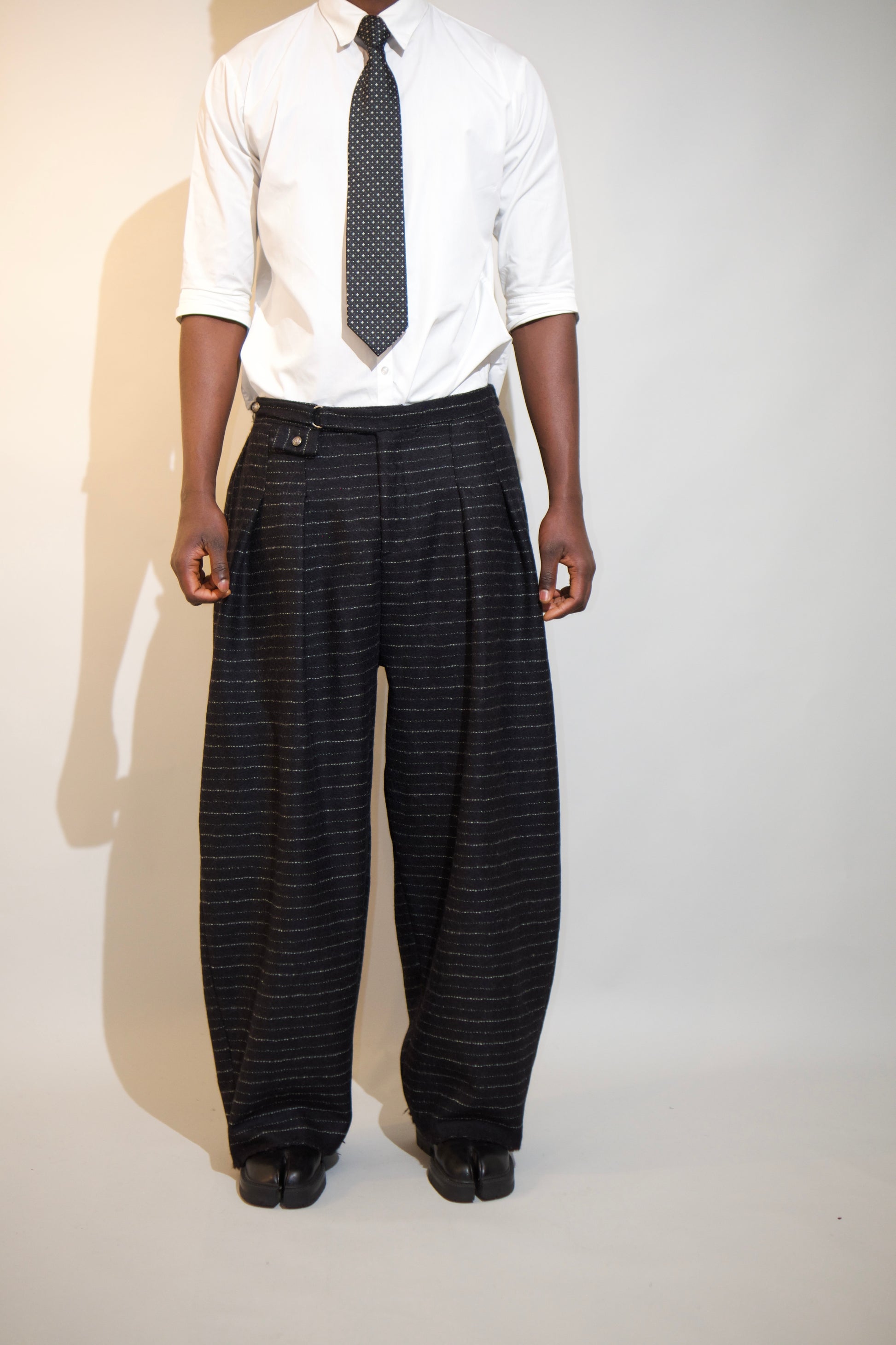 High waisted, wide leg trousers crafted from textured tweed fabric in black horizontal striped wool for a refined, vintage inspired look. Designed with double front pleats for added volume and comfort, featuring a matching fabric belt with metal buckle detail, side pockets, and a relaxed drape through the leg. Ideal for smart casual and formal styling.