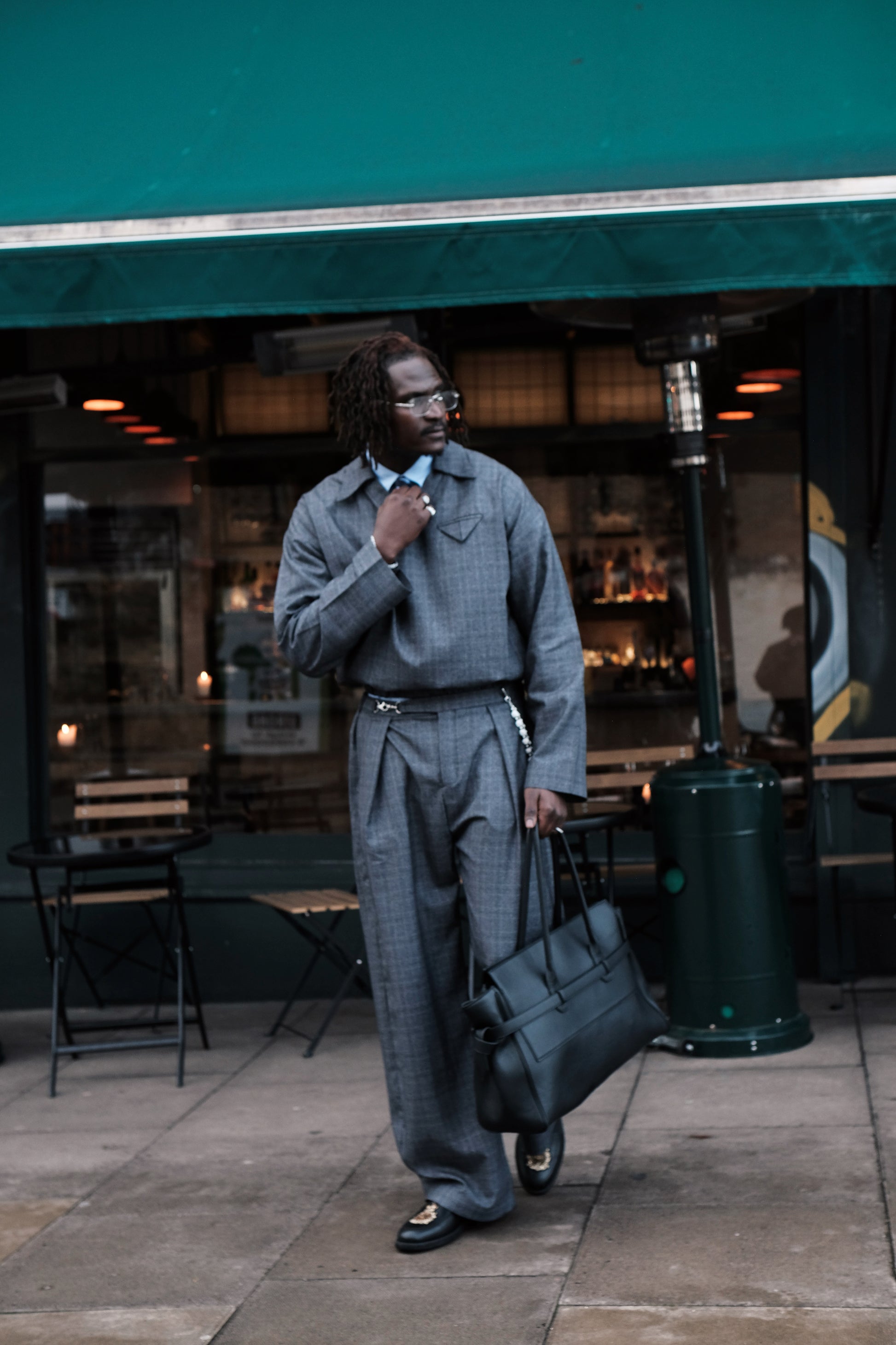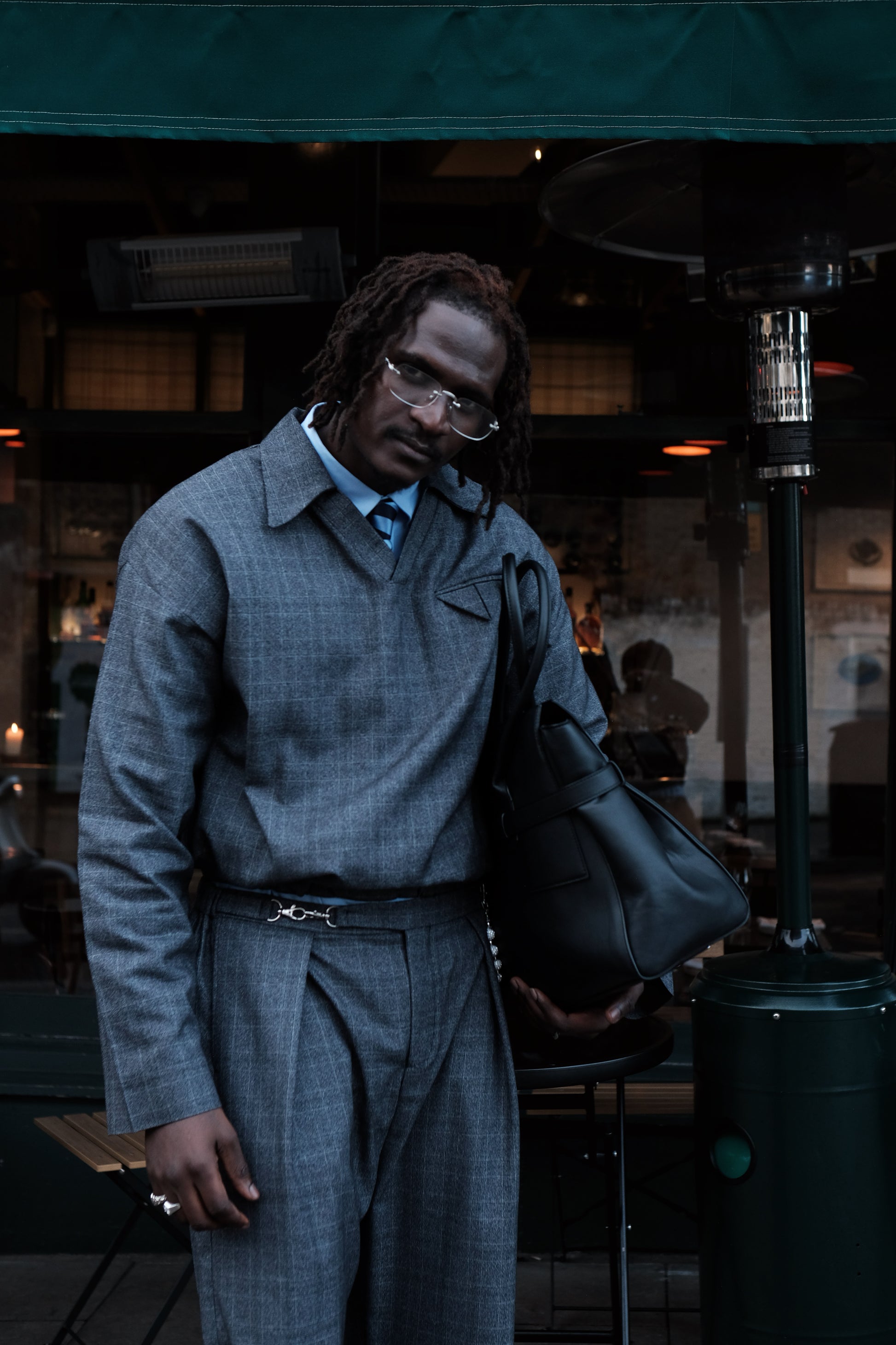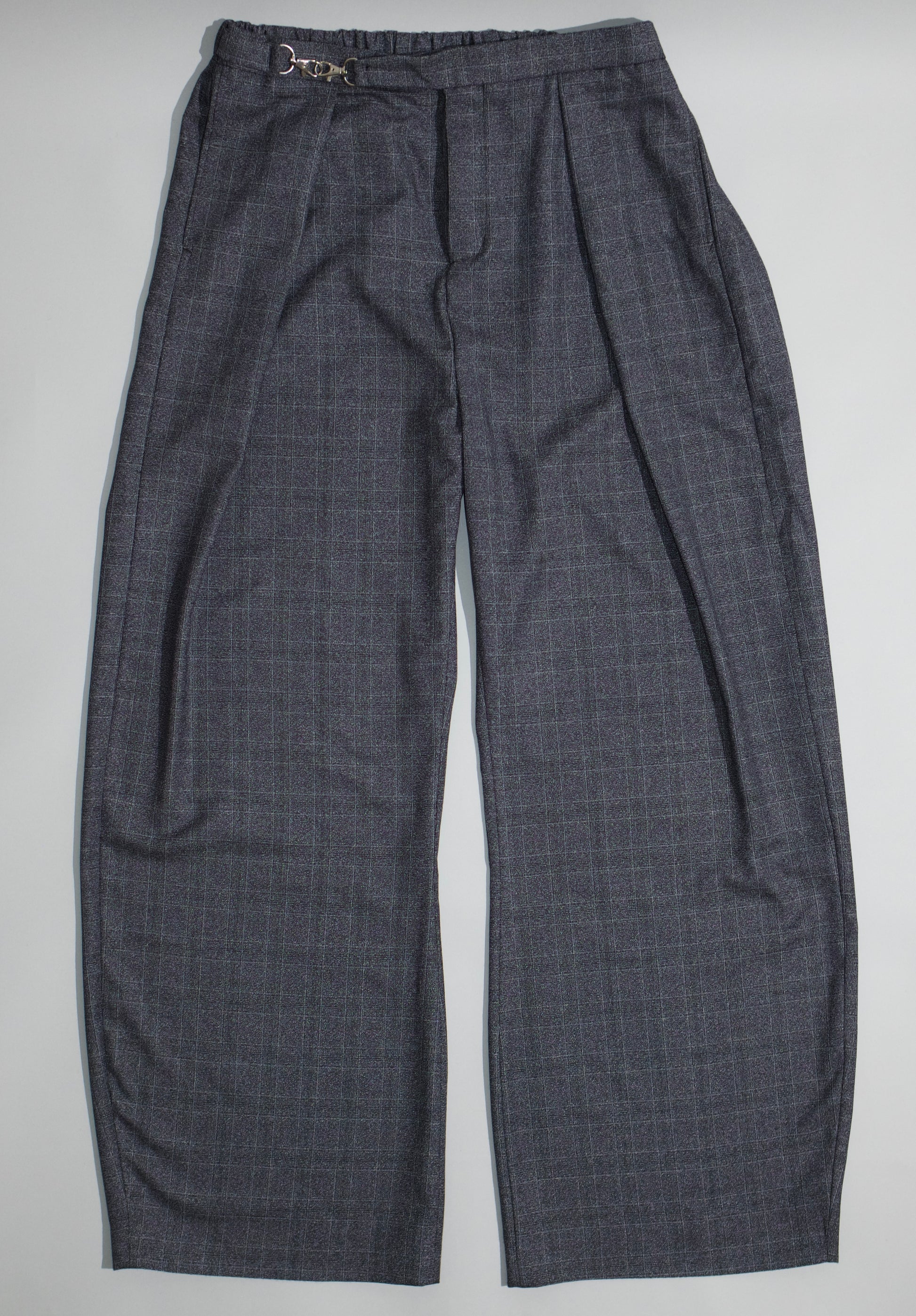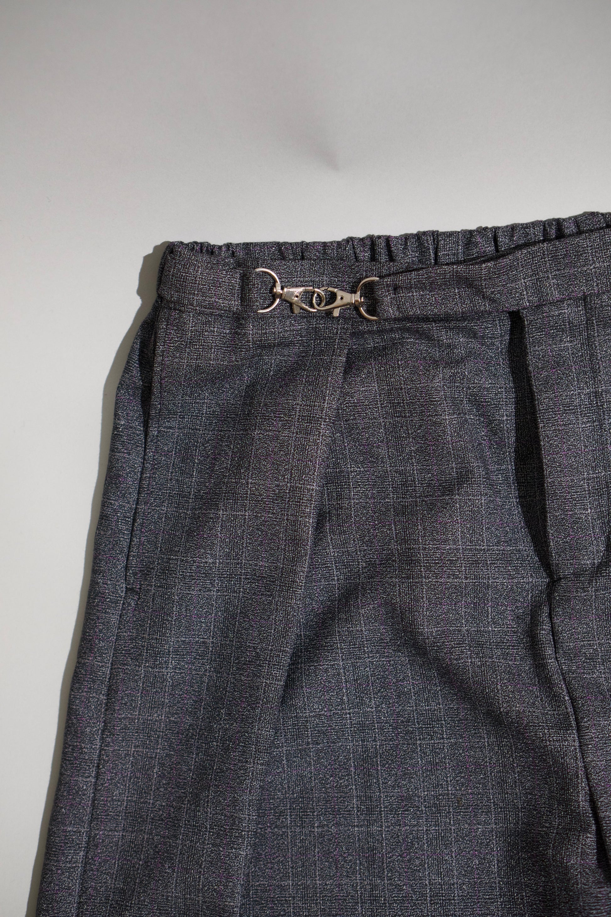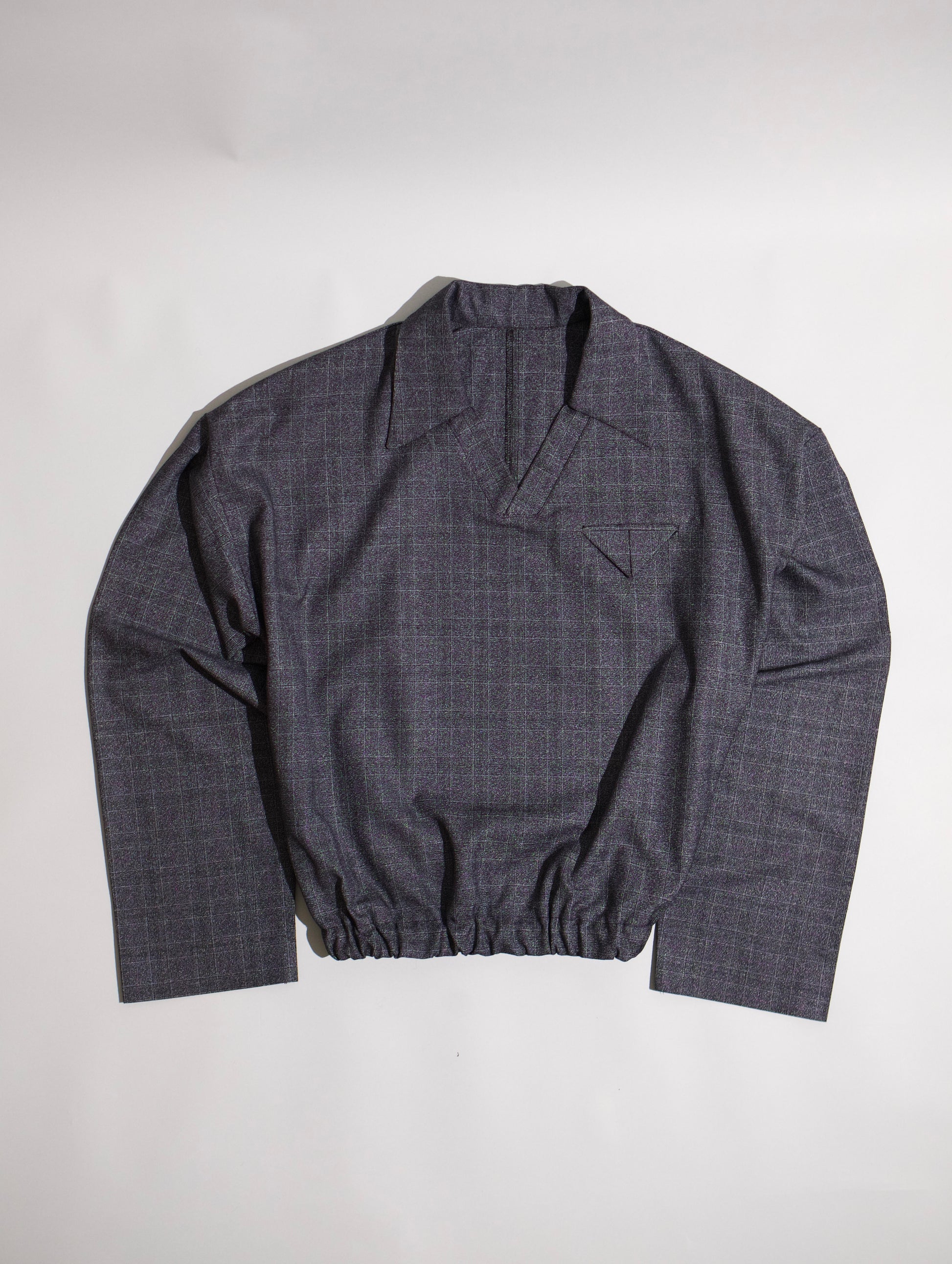 A checkered charcoal grey set featuring a subtle check pattern throughout. It has a relaxed, boxy silhouette with a cropped length and an elasticated hem, creating a gently bloused shape at the waist. The neckline is a soft open V-collar, giving a modern, minimalist feel. Long sleeves add balance to the cropped cut, while a small angular chest detail/pocket adds a distinctive design accent.